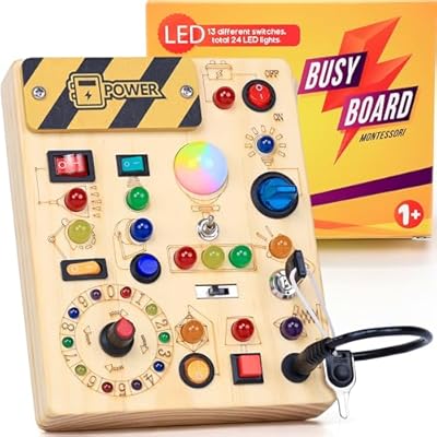 RichBoy Busy Board for 1-3 Year Old, 37 in 1 LED Light Up Wooden Sensory Montessori Switch Board Toy for Toddlers Travel Gift (6.7″ x 5.3″)